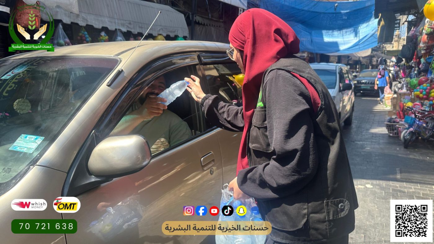 في اليوم الثالث من مشروع سقيا الماء، واصلت جمعية حسنات الخيرية حضورها في سوق صيدا لتوزيع زجاجات ماء بارد على المارة تحت الحرّ الشديد.